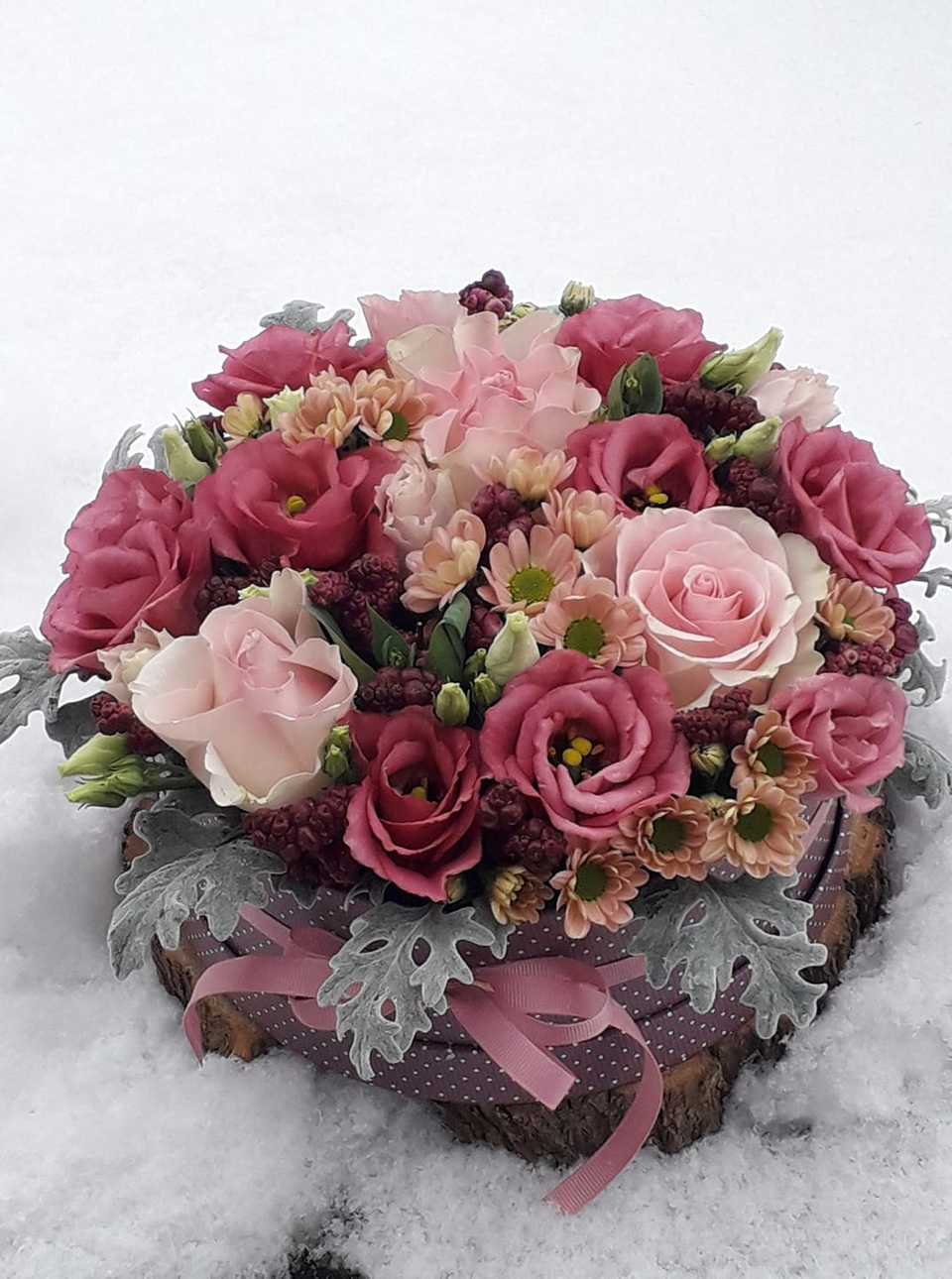 Ez a gyönyörűséges virágdoboz vegyes virágokkal van megtűzve. Lisiantus, Rózsa, Santini és egyéb kiegészítőkkel. A doboz kartonból készült. Átmérője 19 cm. Körbe, szalaggal díszítjük még.
